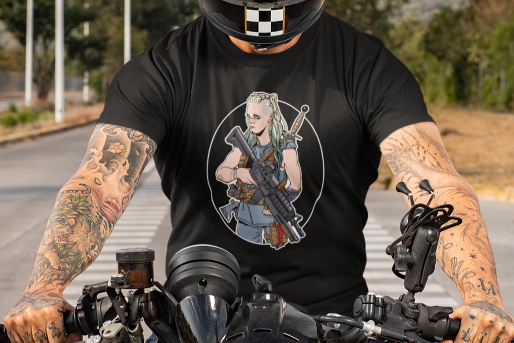 This shirt portrays a contemporary Shield Maiden, resolute and unyielding.