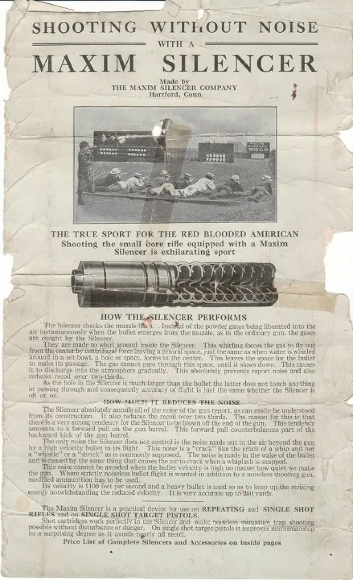 The new product was marketed nationally by the Maxim Silent Firearms Company, claiming that the Silencer “absolutely annuls all of the noise of the report.” It also reduced recoil by two-thirds.